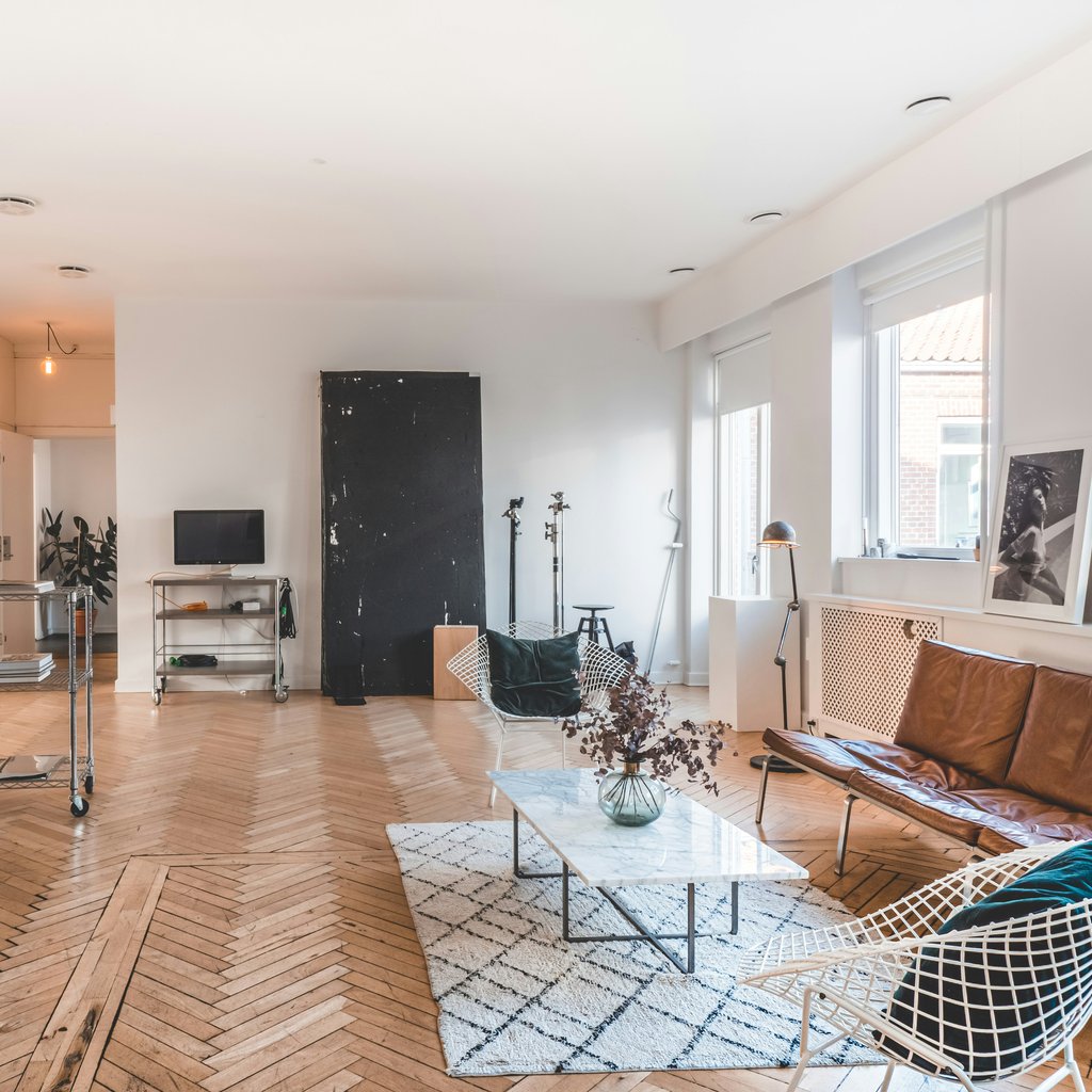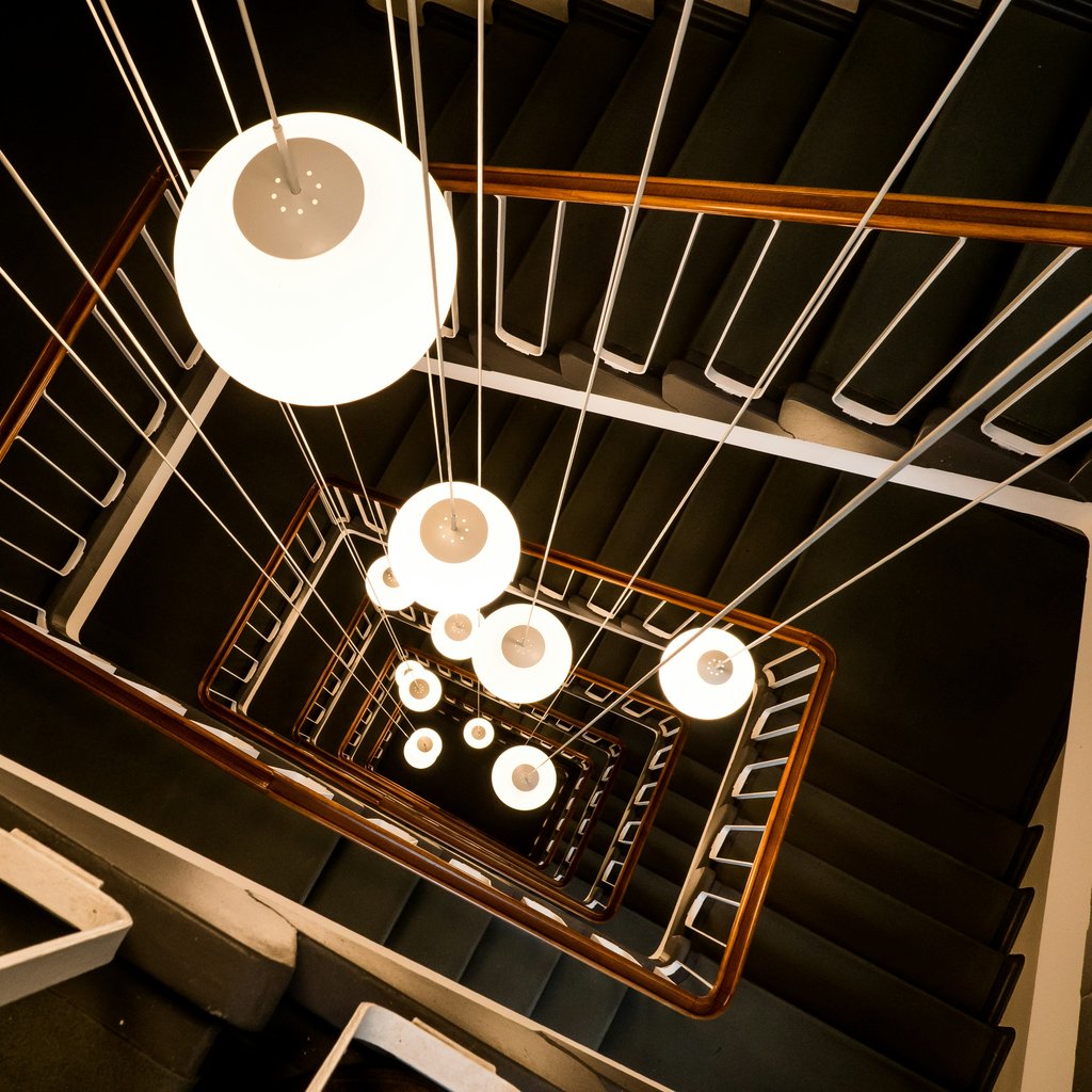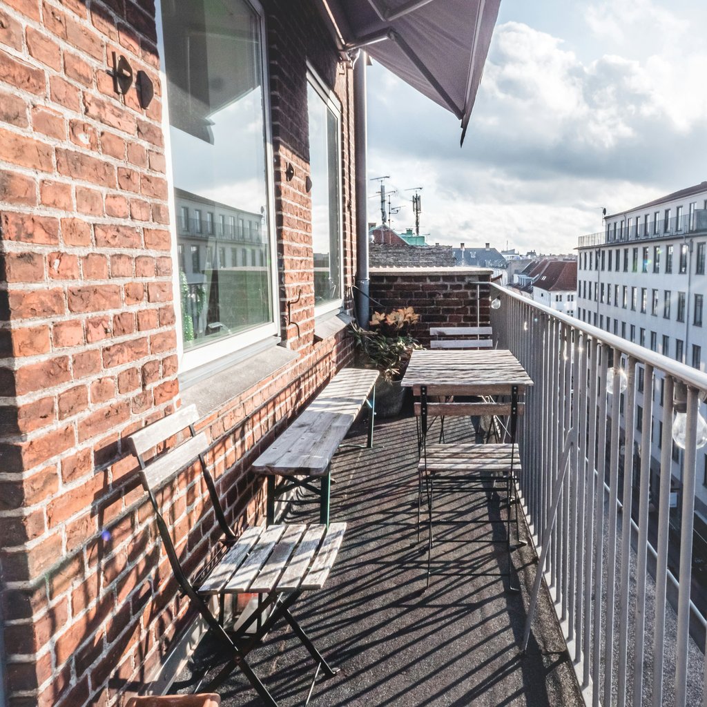 Det her kontor på Dronningens Tværgade 30 er en rigtig lille designperle. Lige fra man træder ind i opgangen med de smukke gelændre og lamper, mærker man, at der er tænkt over detaljerne. Selve kontoret fremstår lyst - og med sildeparket - og der er udgang til en smal terrasse hele vejen rundt om bygningen.