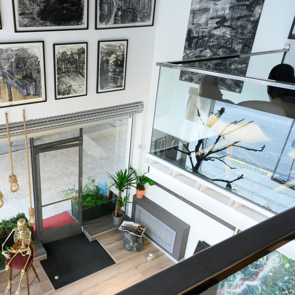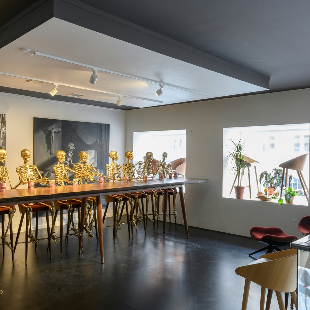 Her kan I få lov at sætte jeres præg på en sal, hvor der er plads til 10 personer. Lejen? 16.000 kroner inklusiv rengøring. Møbler skal man selv medbringe, men underboen er åben for at hænge dyr kunst på jeres vægge. Virkelig dyr kunst. Det er nemlig ikke hvem som helst, der har showroom i stuen under. Ps. kunstværket, som selvfølgelig hedder: "Den sidste nadver", rykker væk, når I rykker ind.