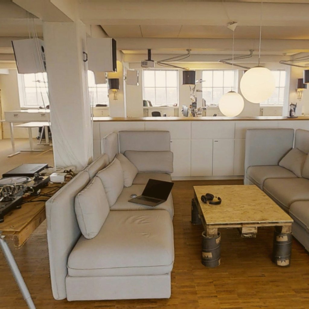 Loungeområdet i midten kan bruges til uformelle møder eller en pause fra skrivebordet og dj-pulten sørger for musik i hele kontoret, når der er fredagsøl.