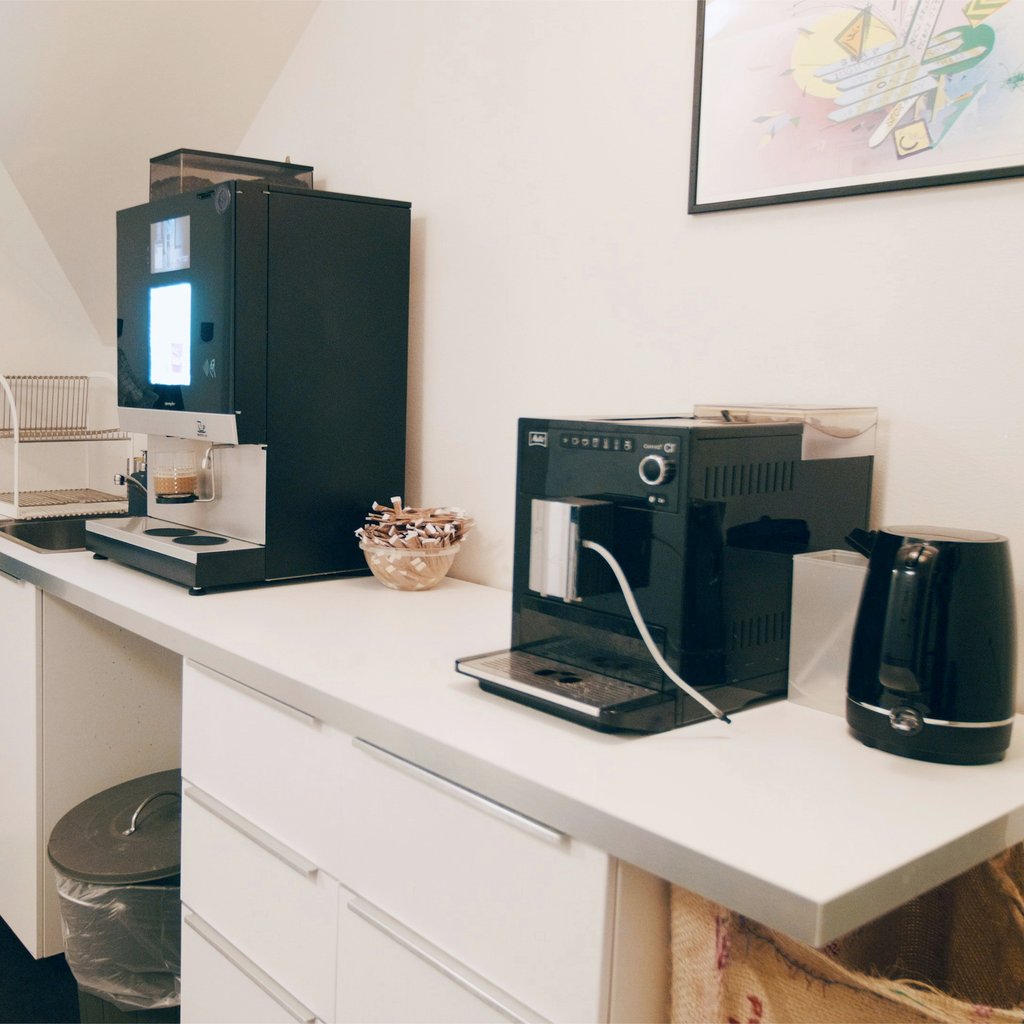 Som lejer får du adgang til et tekøkken hvor der kan hentes varm kaffe og te. Desuden er der et fælles mødelokale med plads til ti personer.