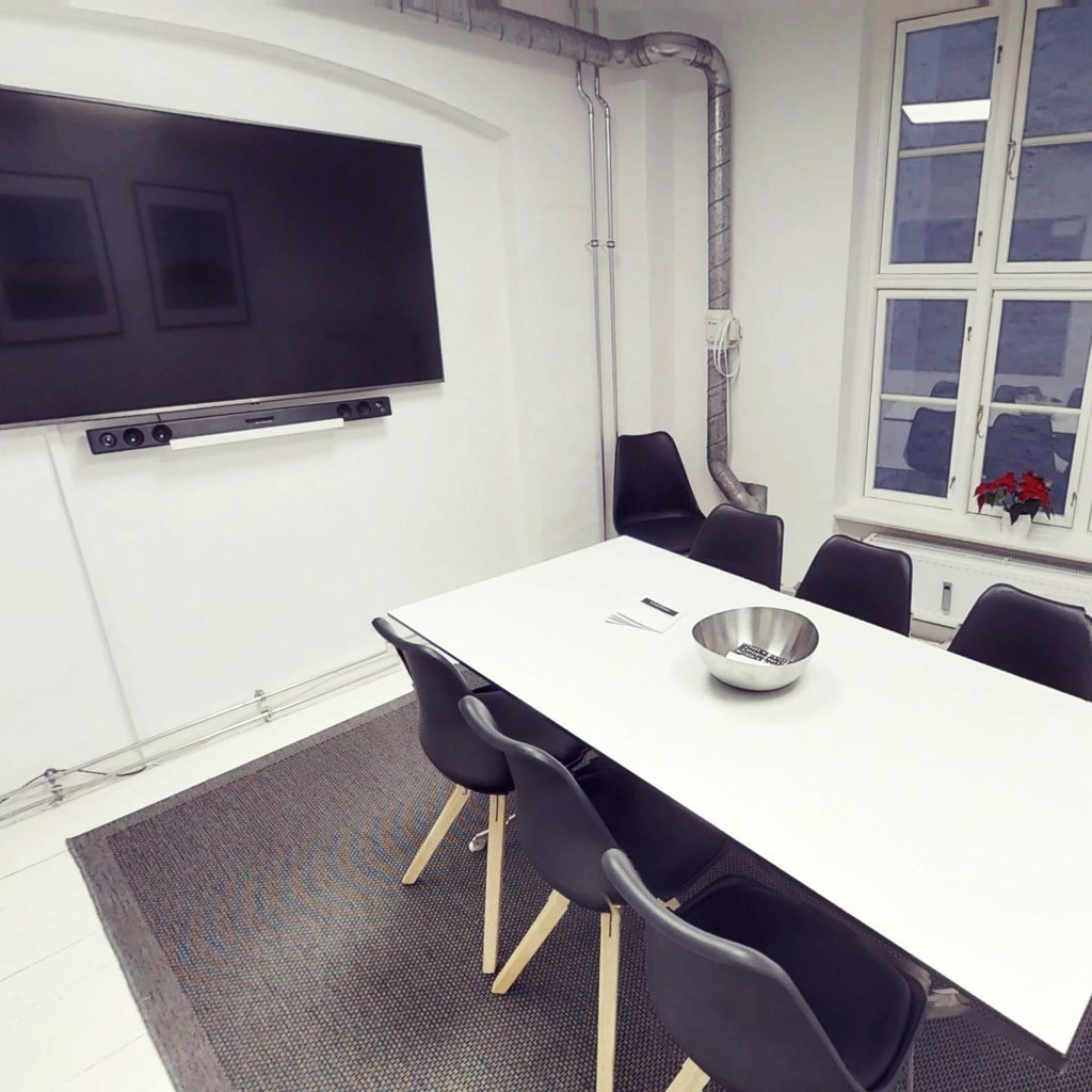 Mødelokale med plads til 8 personer og udstyret med glastavle/board samt 65 tommer TV-skærm til præsentationer trådløst (via Chromecast) fra laptop.