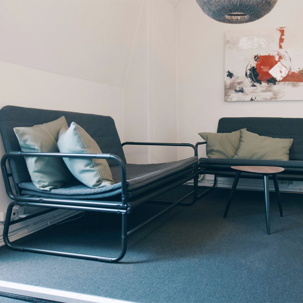Kontoret er møbleret med skriveborde, opbevaring og en hyggelig sofasektion. Der kan dog også sættes ekstra skriveborde ind hvis det ønskes.