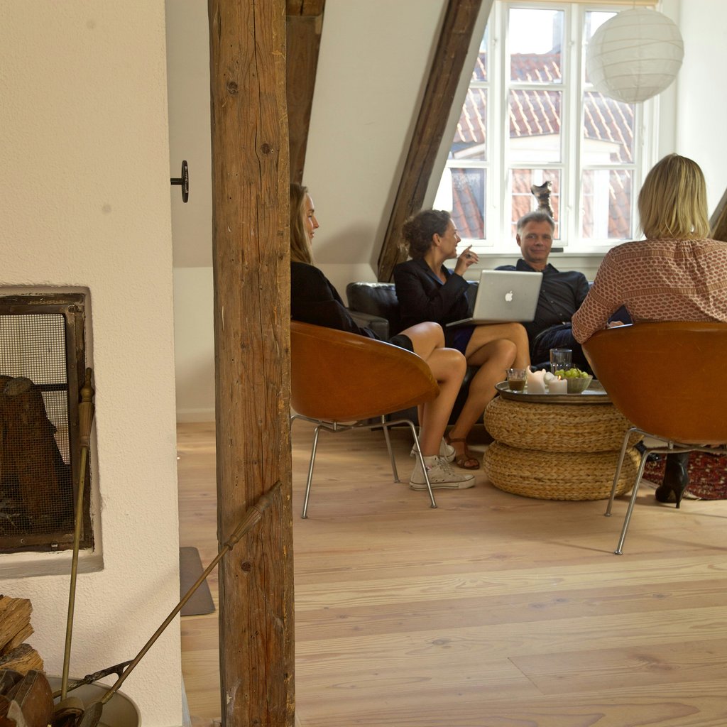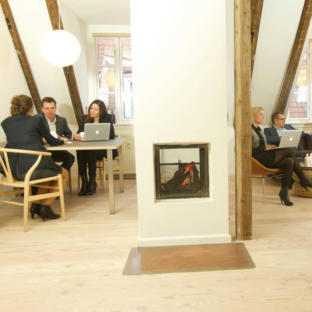 På Hyskenstræde 10 finder du denne perle af et kontor. Her får du pejs, sofa, et lille køkken og udsyn til de fritlagte bjælker, der bryder de hvide vægges monotoni. Selve kontorpladserne er en del af stort åbent miljø, hvor du kommer til at møde stedets andre spændende beboere.