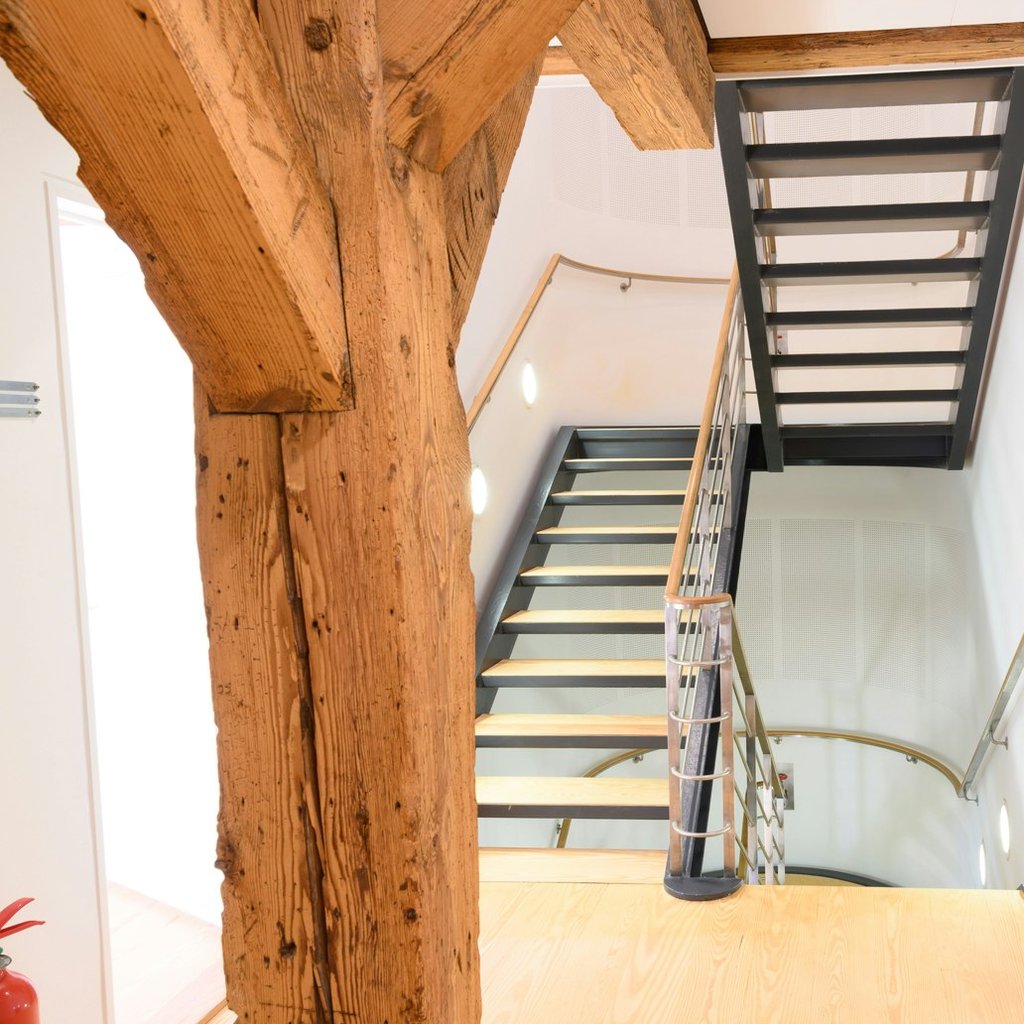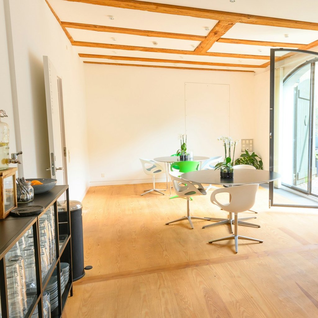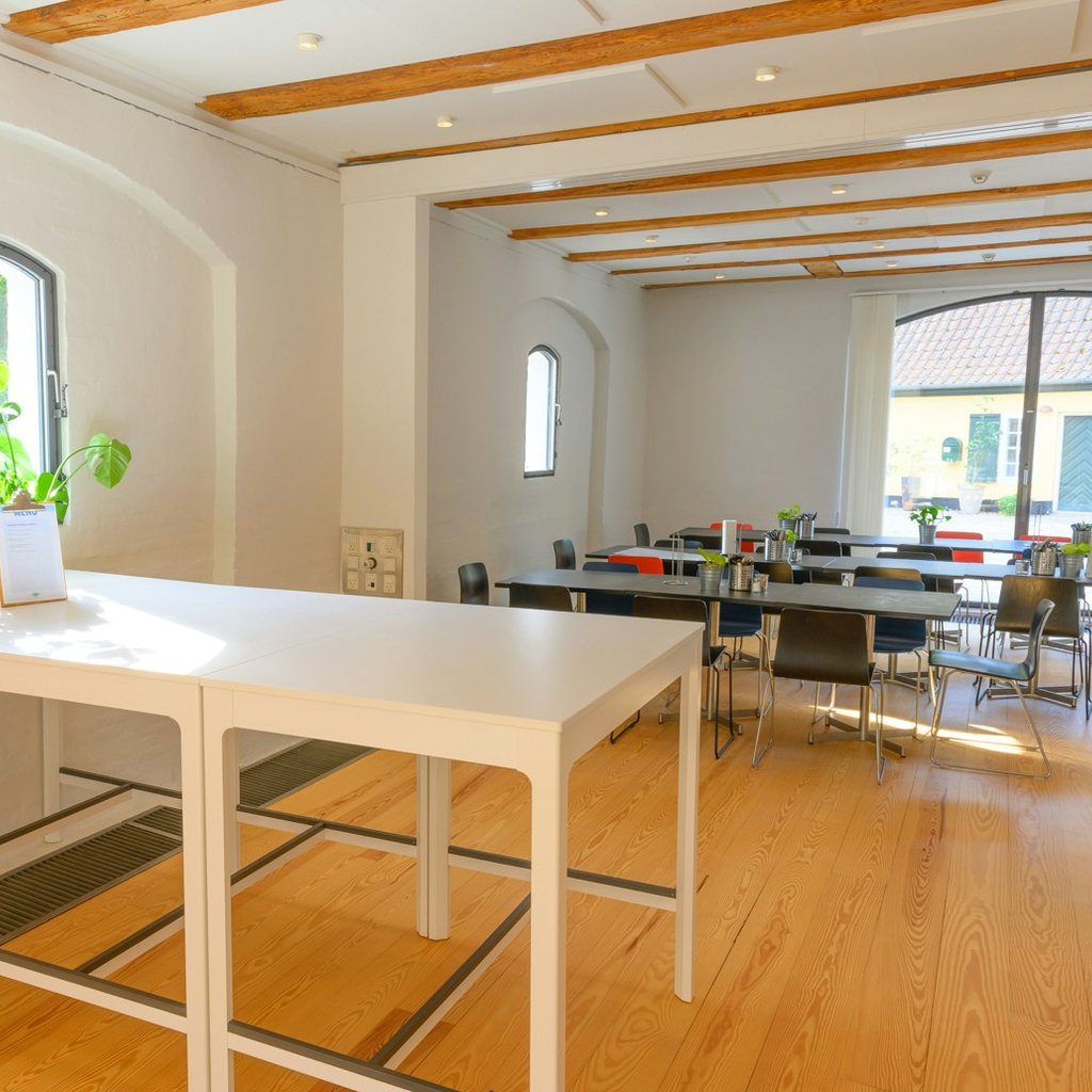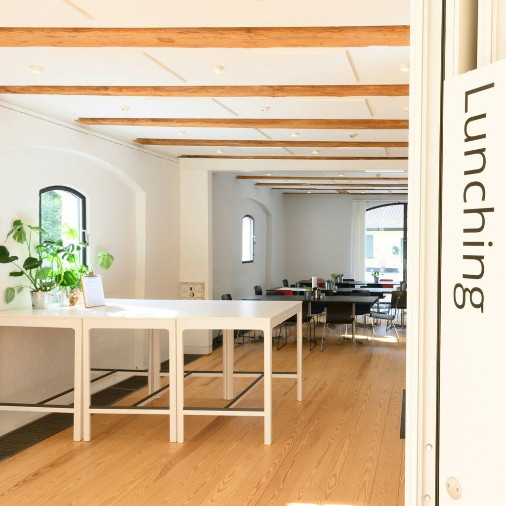 Kontorerne er lyse og lækre med højt til loftet, og flere steder finder du flotte detaljer som fritlagte bjælker, grønne planter og store vinduer. Kontoret er fuldt møbleret, så det eneste i skal gøre er at sætte strøm til jeres monitors. Her får I også mulighed for at købe jer ind i en lækker frokostordning, der byder på alt fra samosa til chorizo-pølser.