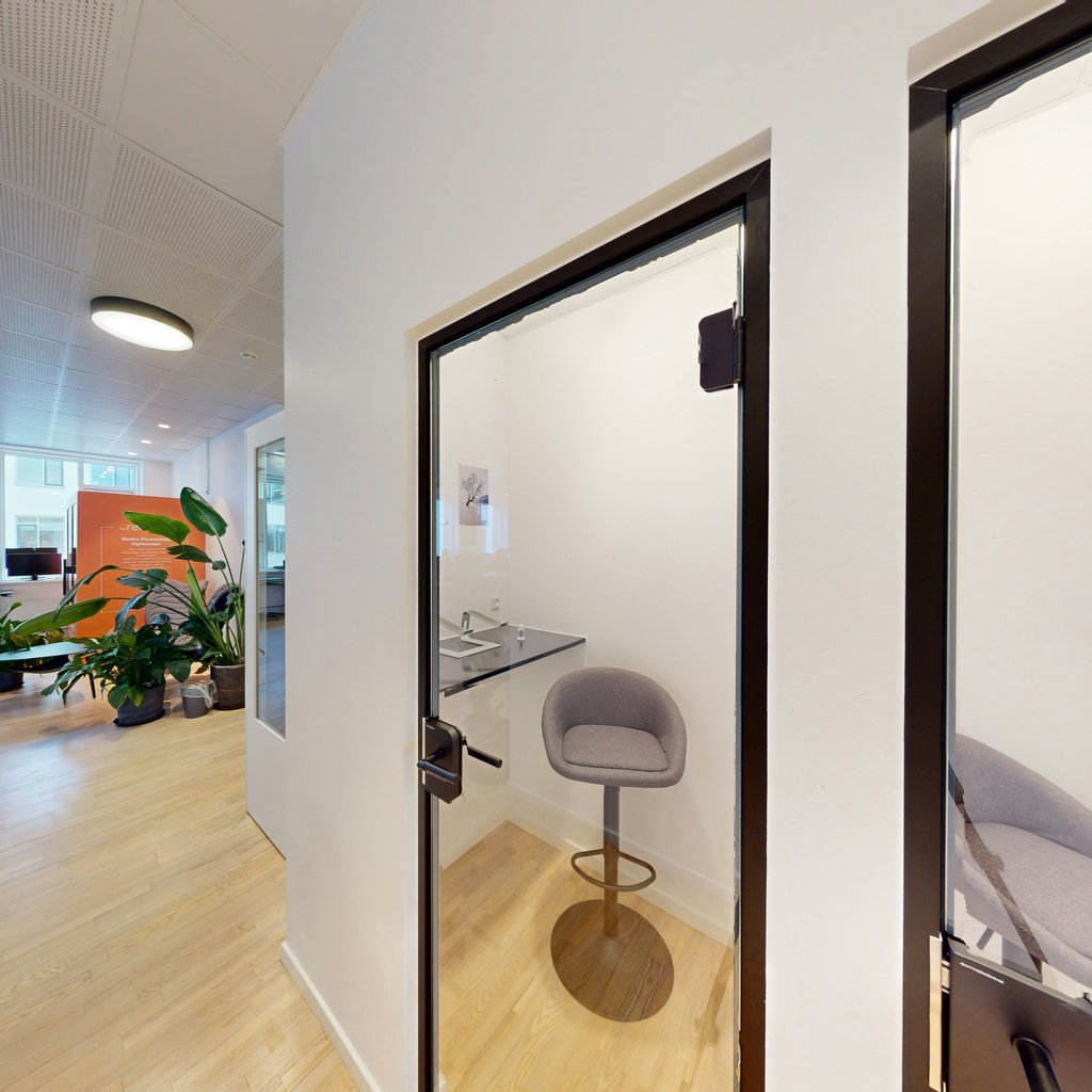 Indretningen er gennemtænkt for storrumsmiljø, der er flere mødebokse og telefonbokse, til når man lige har et kald eller et videomøde.
