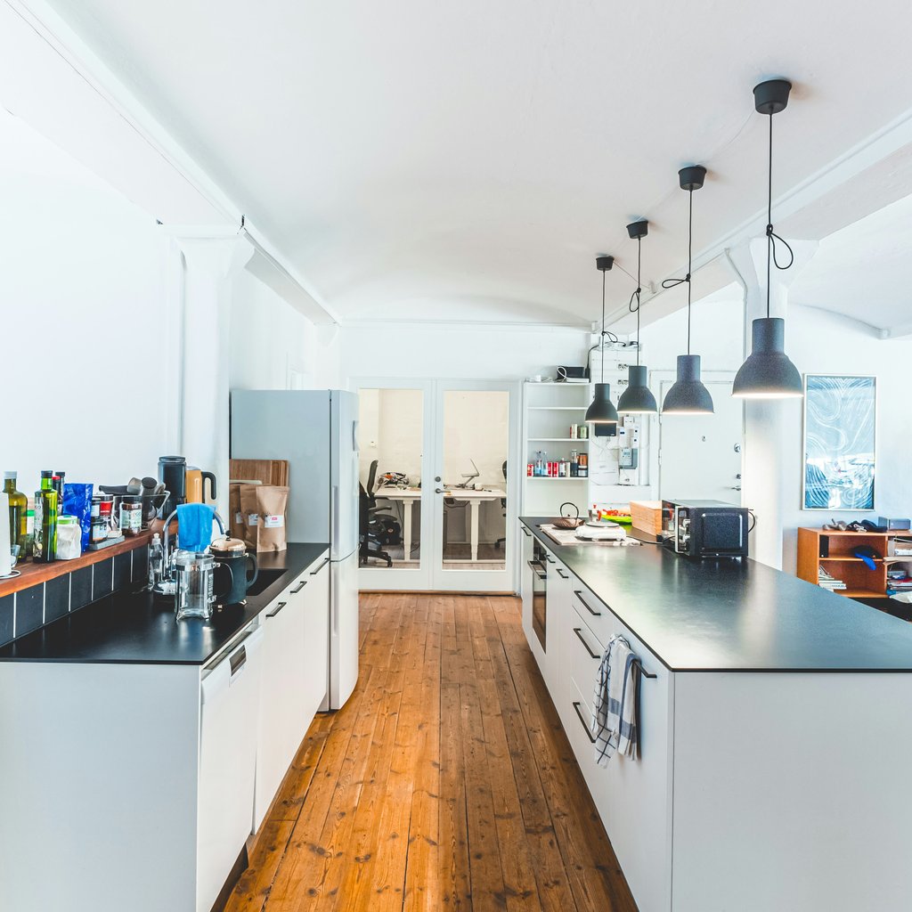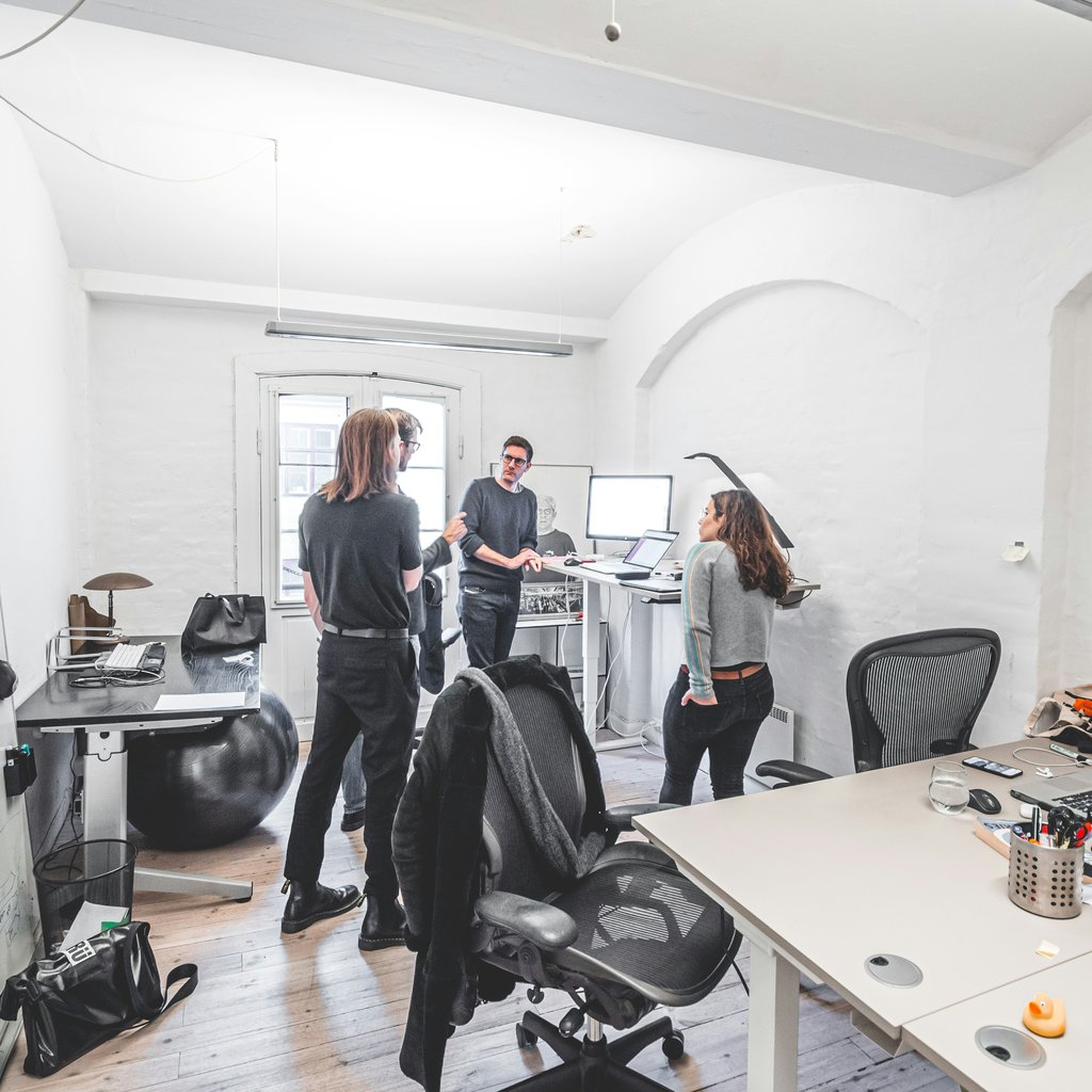 Kontorfællesskabet huser omkring 20 personer, men har alt hvad du har brug for. Internet, kaffe, print, køkken, mødelokaler og en rigtig fin udsigt til rådhustårnet. Ring til os og hør mere om Lab5 på Larsbjørnsstræde.