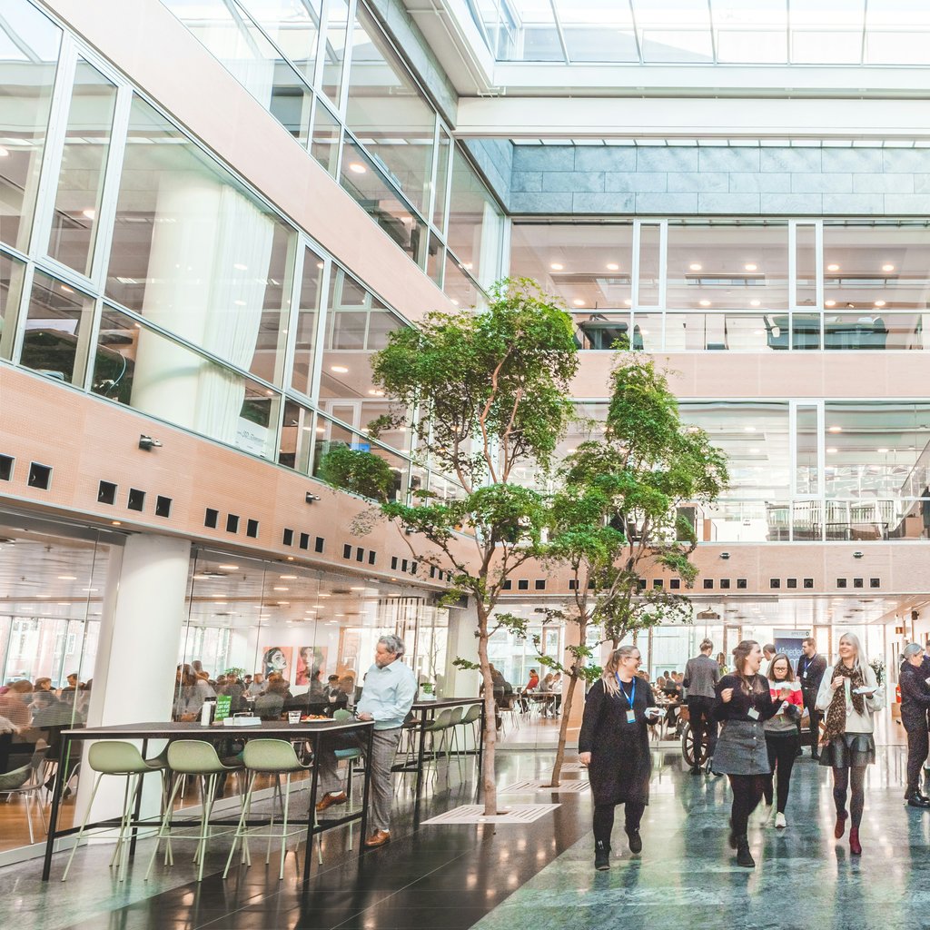 På øverste etage er der loungeområder hvor du kan sidde og arbejde med din computer. Derudover er der også en kæmpe tagterrasse og unikke mødelokaler med en suveræn udsigt.