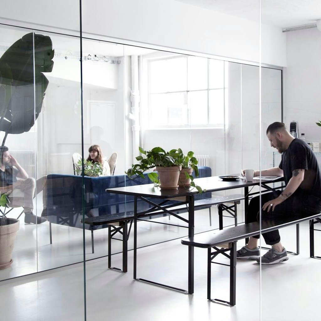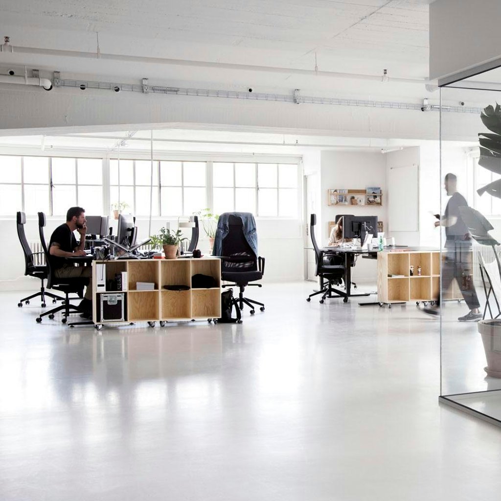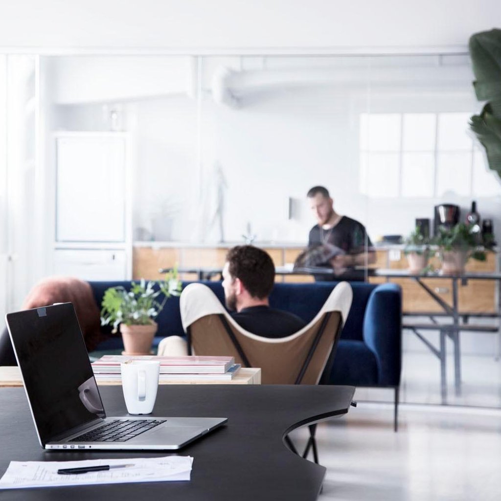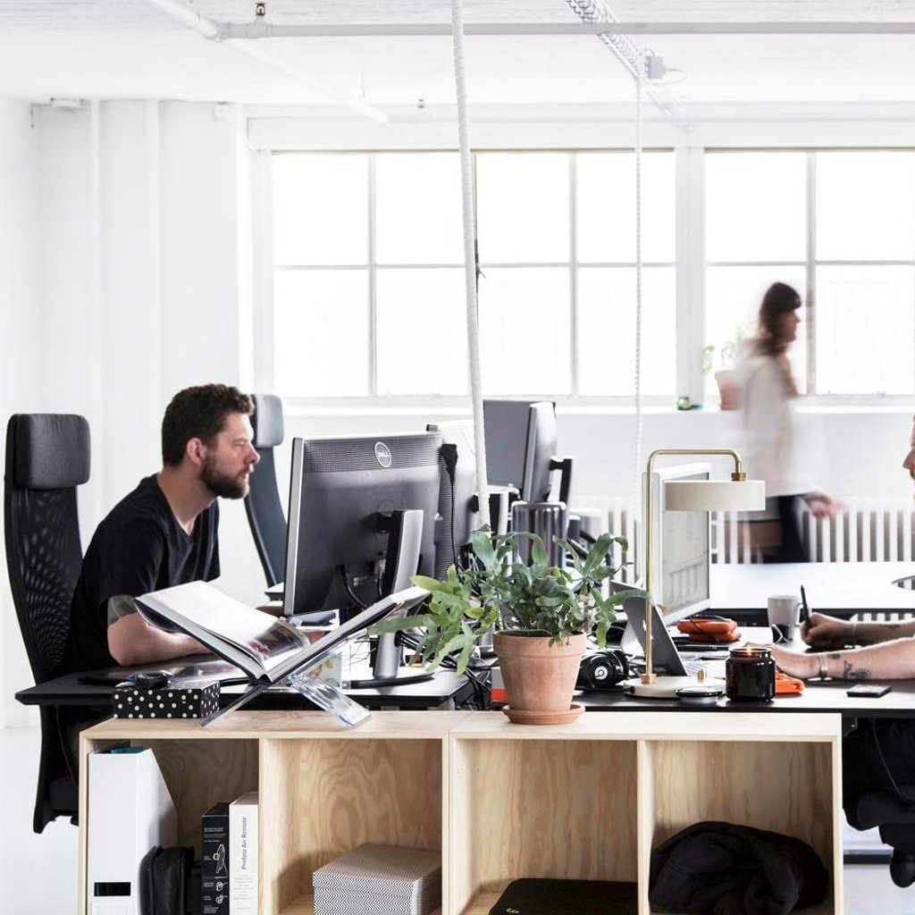 Kontoret er på 140kvm men har kun 7 skriveborde - det efterlader god plads til opbevaringsmuligheder og et lille loungeområde, hvor man kan slå benene op. Når det blir' fredag er der tradition for at snuppe en kold fredagsøl 🍻