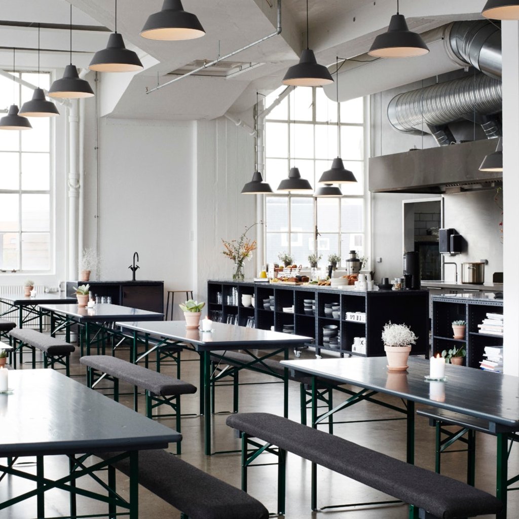 I det lækre køkken er der alt hvad du skal bruge til at få dagligdagen til at fungere i form af service, kaffemaskine og køleskab. Lokalet ligger på 1.sal og har derfor masser af naturligt lys. Her er også et mødebord, hvor man kan sidde afskærmet for resten af kontoret.