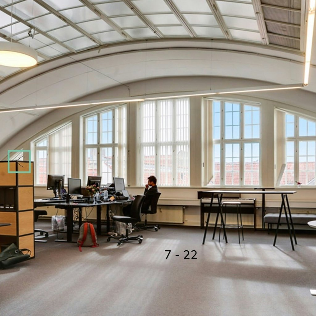 Med det her kontor får I 607 kvadratmetre at boltre jer på. Hver måned koster det 1800 kroner per kvadratmeter, den månedlige drift og skatter koster 259,2 og vand og varme koster 112,8.